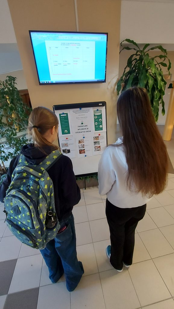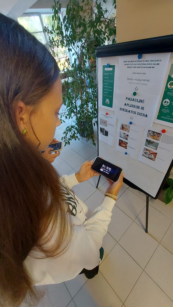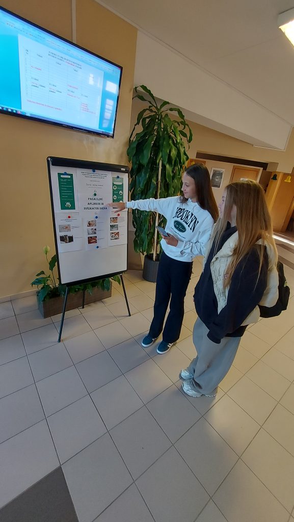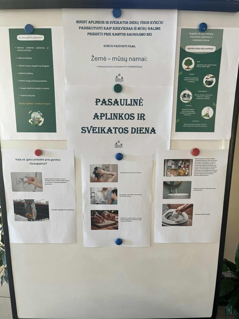 Rugsėjo 26 d. mūsų gimnazijoje buvo paminėta Pasaulinė aplinkos ir sveikatos diena. Iliustruotame stende mokiniai galėjo susipažinti, kaip užterštas oras, vanduo ar dirvožemis daro žalą žmogaus sveikatai. Pamokų metu buvo primenama, kaip kiekvienas galime prisidėti prie gamtos išsaugojimo – tausoti gamtos išteklius, mažinti vartojimą, rūšiuoti atliekas.