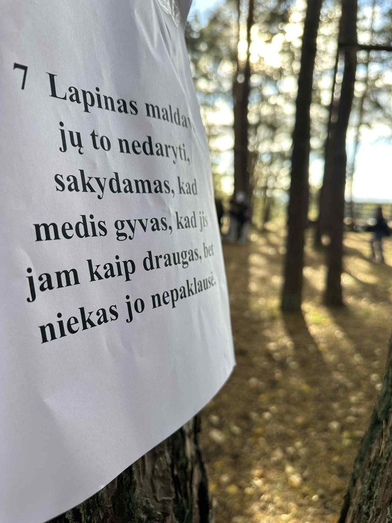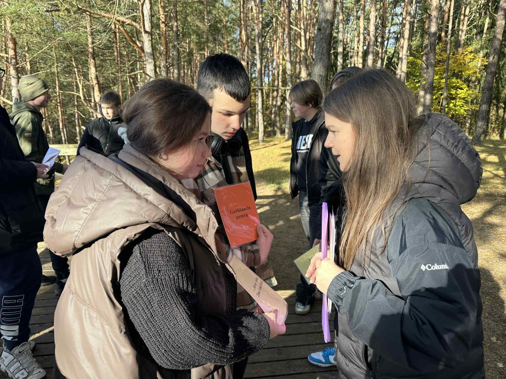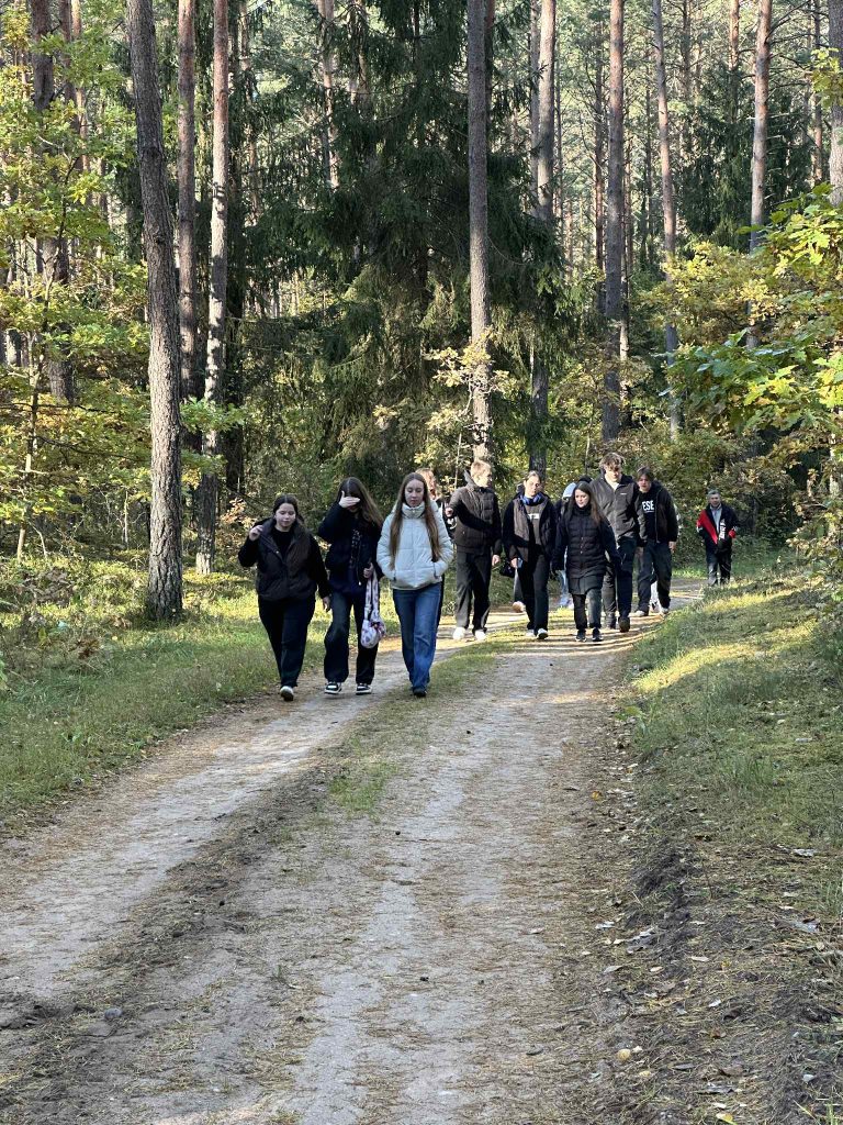 Eidami pėsčiųjų taku mokiniai ne tik grožėjosi Kernavės apylinkėmis, bet ir klausėsi Vinco Krėvės apsakymo „Skerdžius“. Rudenėjanti gamta, Baltojo kalno panorama, menanti Lietuvos valstybės ištakas, tapo puikiu fonu apmąstyti literatūrinį pasakojimą apie žmogaus ryšį su gamta. Išklausę garsinį tekstą mokiniai atliko užduotis: pirmiausia vieni gavo korteles su knygos ištraukomis, o kiti – su pagrindinio veikėjo Lapino apibūdinimais. Reikėjo rasti tinkamą „porą“. Skirtingų gimnazijų mokiniai veikė išvien, tai padėjo kurti glaudesnį projekto dalyvių ryšį. Vėliau mokiniai turėjo sunumeruoti apsakymo įvykius, kurių seka buvo pramaišiui iškabinta ant medžių. Kitą dieną per lietuvių kalbos ir literatūros pamoką gimnazistai atliko teksto suvokimo testą, kad pagilintų žinias. Projekto vadovės – lietuvių kalbos ir literatūros vyresniosios mokytojos Daiva Pugačiovienė ir Vera Berniukevič – pabrėžė, kad tokios išvykos leidžia mokiniams pažinti literatūrą ne tik klasėje, bet ir gamtoje. „Suprasti tekstą einant ir besidairant – tikras iššūkis, nes susikaupti gali būti sunkiau, tačiau tai tampa tikruoju patyrimu ir kuria asociatyvų santykį su kūriniu“, – teigė mokytojos.