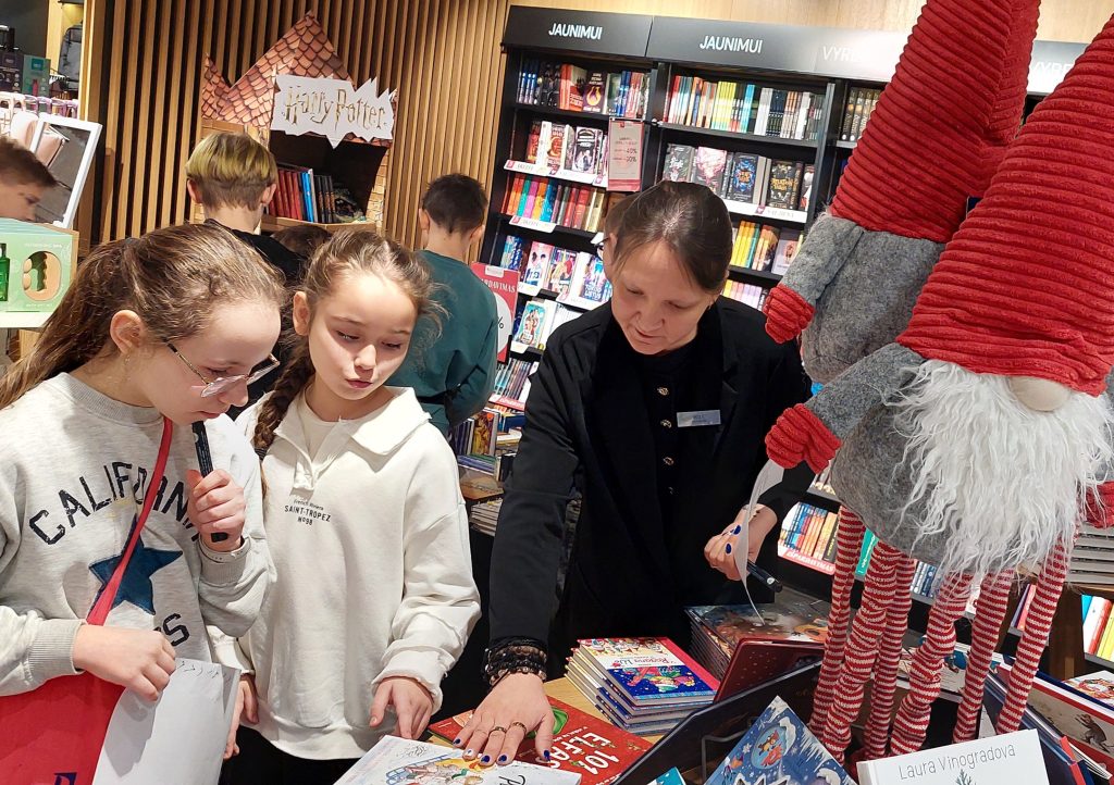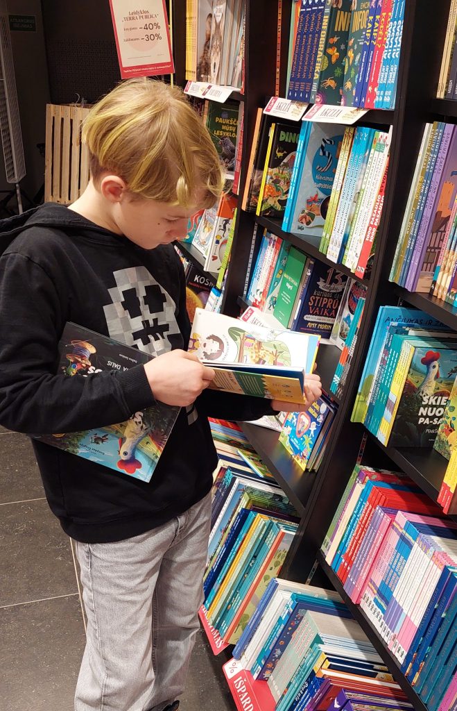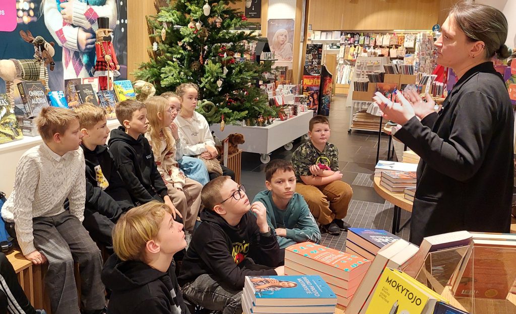 Pirmoji išvykos dalis vyko „Pegaso“ knygyne, kur mokiniai dalyvavo edukaciniame užsiėmime. Jo metu vaikai susipažino su knygyno veikla, sužinojo, kokius darbus atlieka knygyno darbuotojai, kaip knygos pasiekia skaitytojus ir kokia yra skaitymo kultūros reikšmė. Mokiniai žaidė žaidimą „5 sekundės“, lavinusį greitą mąstymą ir reakciją, o pasiskirstę į grupes atliko paskirtas užduotis, reikalavusias bendradarbiavimo, pastabumo ir kūrybiškumo. Šios veiklos skatino domėjimąsi literatūra ir ugdė komandinio darbo gebėjimus.