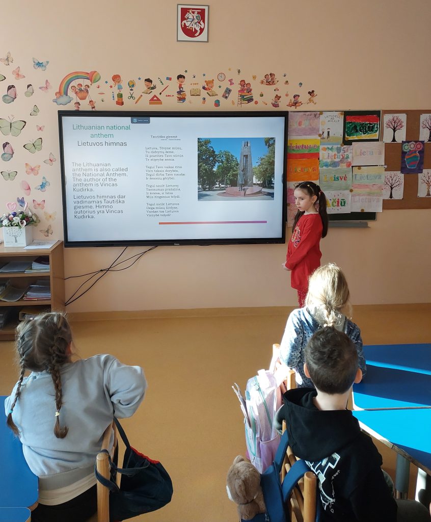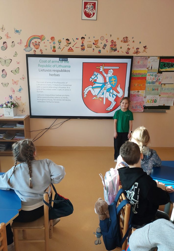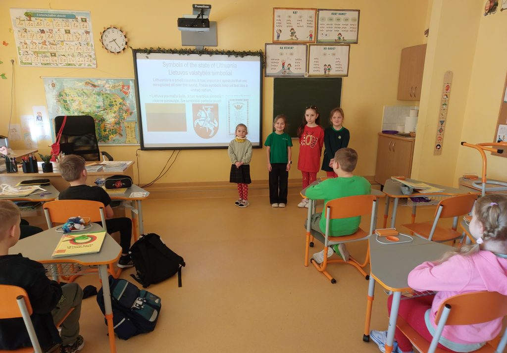Norėdami geriau susipažinti su Lietuvos simbolika ir ją pristatyti projekto partneriams, pirmokai kartu su savo mokytoja Jolanta Pašutiene parengė skaidres. Jose kūrybiškai pateikė surinktą informaciją apie valstybės vėliavą, herbą ir himną, paaiškino kiekvieno simbolio reikšmę ir prasmę.