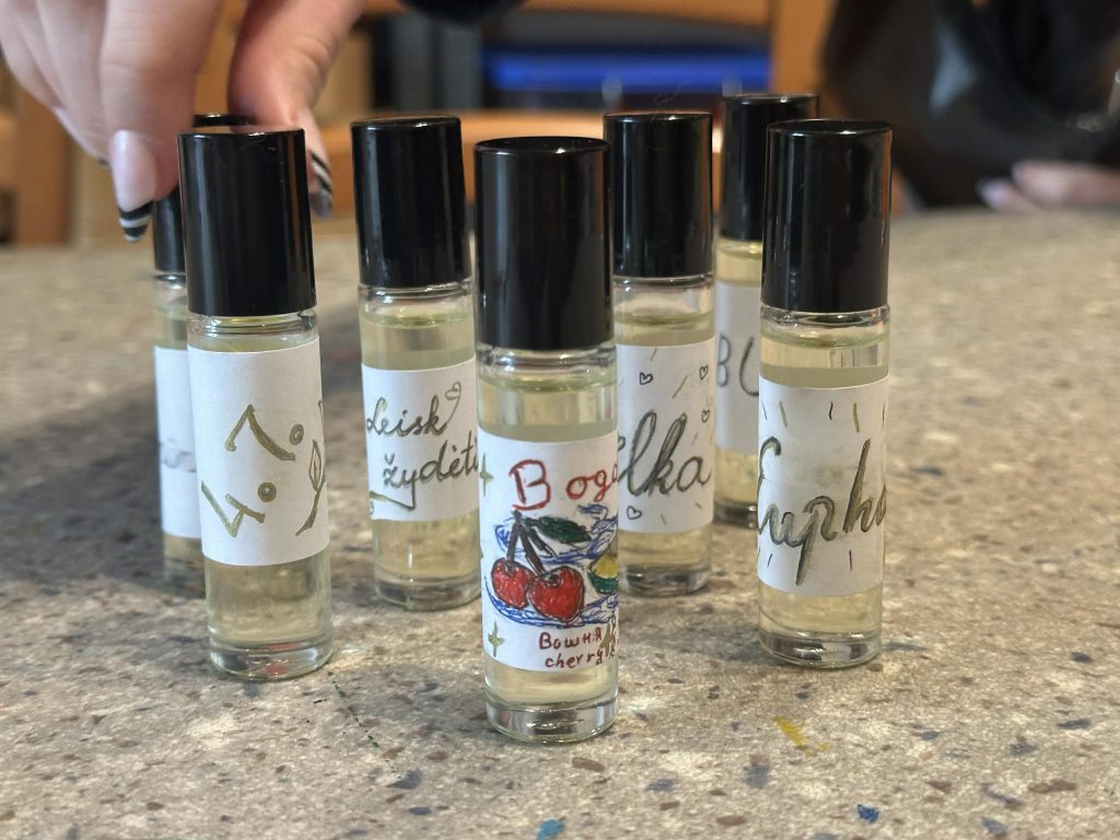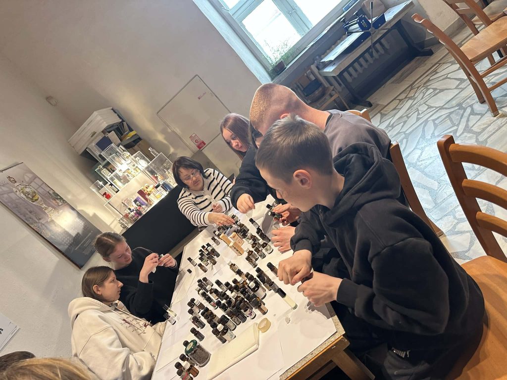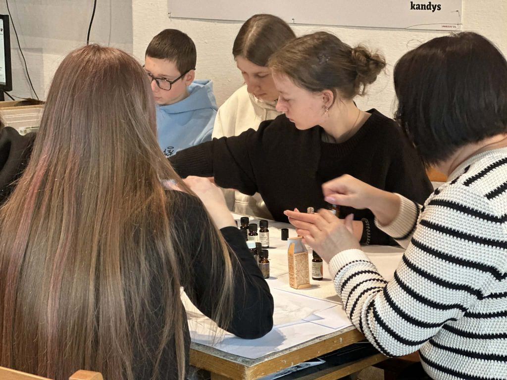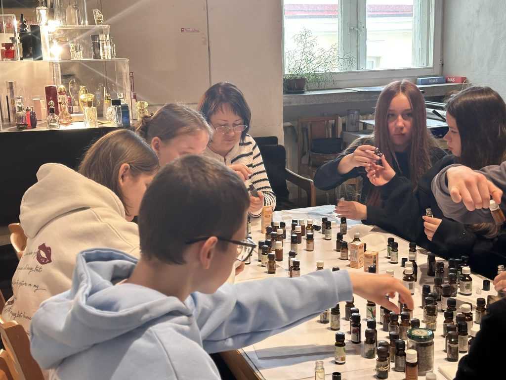 Balandžio 7 dieną I G klasės mokiniai turėjo galimybę patys prisiliesti prie šio išskirtinio meno pasaulio dalyvaudami edukacijoje „Kvapas, spalva ir forma“. Gimnazistai kūrė savo unikalius kvepalus iš eterinių aliejų, eksperimentavo su kvapų deriniais ir ieškojo harmonijos tarp skirtingų natų. Kūrybinis procesas tuo nesibaigė – jie taip pat kūrė etiketę savo kvepalų buteliukui, taip suteikdami savo darbui individualumo ir estetinės vertės.
